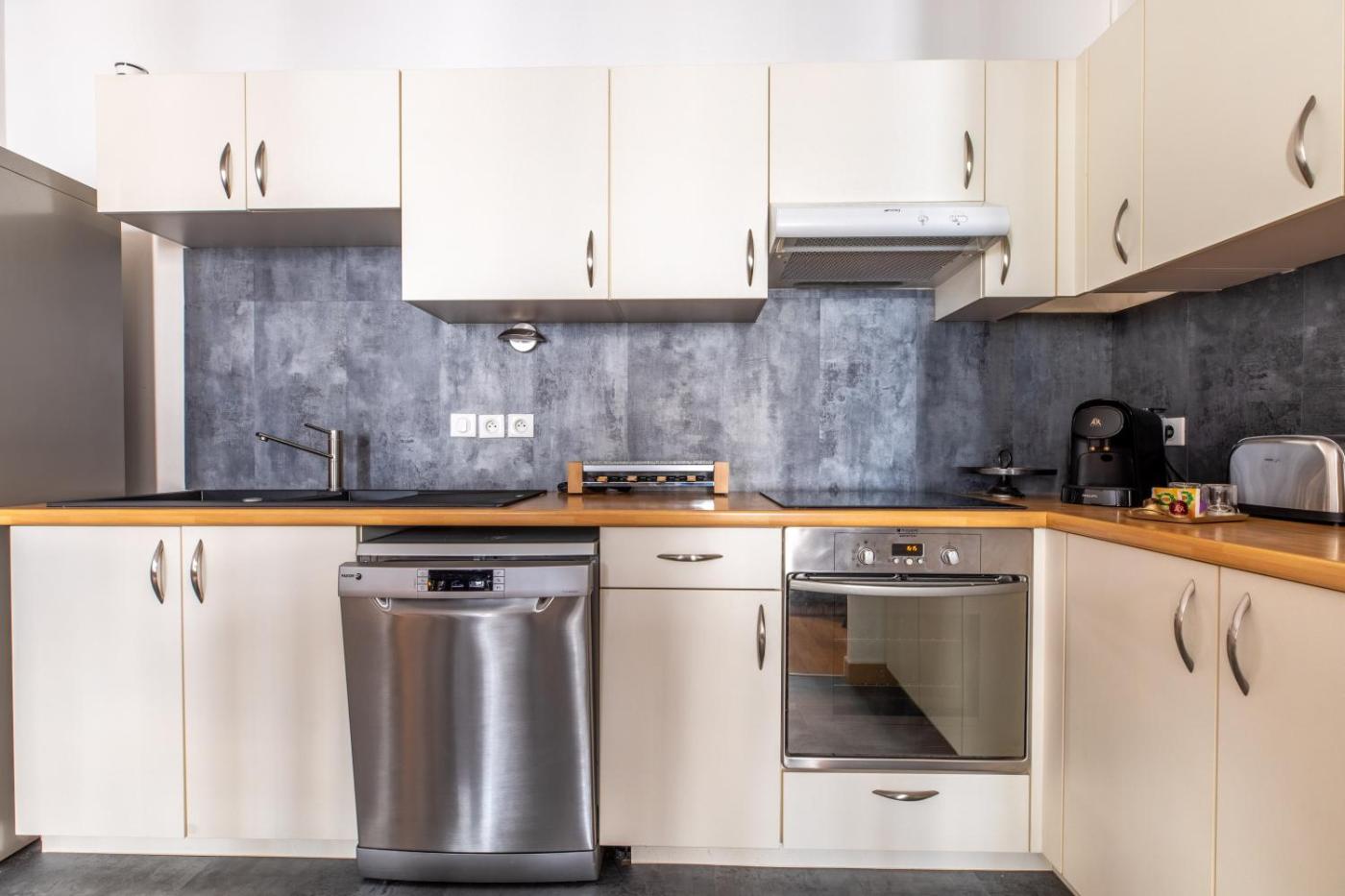 One-Bedroom Apartment. This apartment comprises 1 living room, 1 separate bedroom and 1 bathroom with a walk-in shower and free toiletries. Guests can make meals in the kitchen that comes with a stovetop, a refrigerator, a dishwasher and kitchenware. The apartment features parquet floors, a seating area with a flat-screen TV, a washing machine, a tea and coffee maker as well as city views. The unit offers 2 beds.