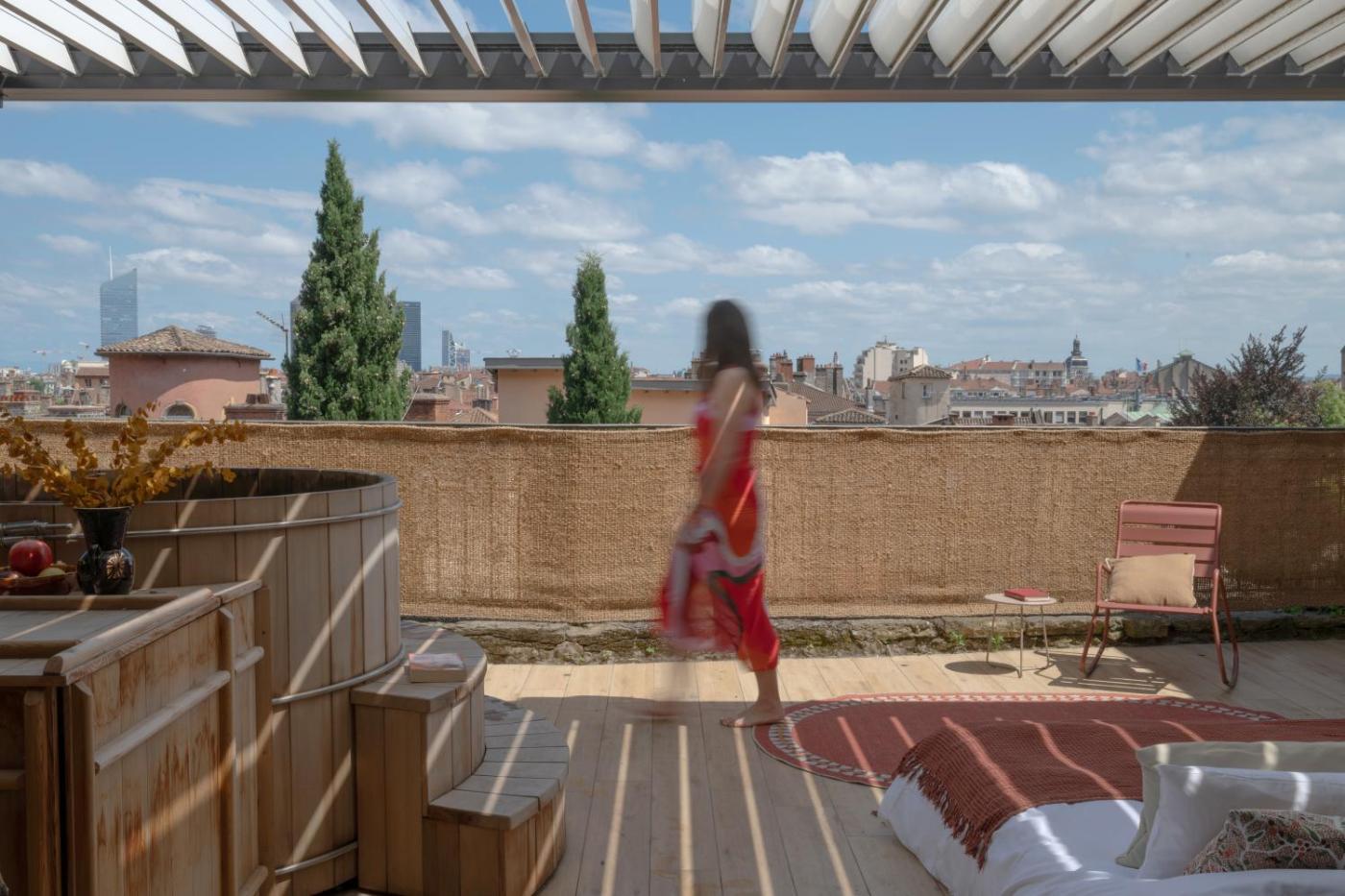 Maison Rose – bain nordique jacuzzi. This double rooms standout feature is the hot tub. Offering free toiletries and bathrobes, this double room includes a private bathroom with a walk-in shower, a hairdryer and slippers. Meals can be prepared in the kitchenette, which is fitted with a refrigerator, a microwave and a tea and coffee maker. There is air conditioning, a minibar and a terrace and complimentary winechampagne is offered for guests. The unit has 1 bed.
