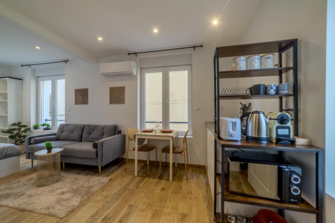 Deluxe One-Bedroom Apartment. Featuring a private entrance, this air-conditioned apartment comprises 1 living room, 1 separate bedroom and 1 bathroom with a walk-in shower and a hairdryer. Meals can be prepared in the well-fitted kitchen, which is equipped with a stovetop, kitchenware, a microwave and a toaster. The apartment provides a washing machine, a tea and coffee maker, a seating area, a dining area and a flat-screen TV with streaming services. The unit offers 1 bed.